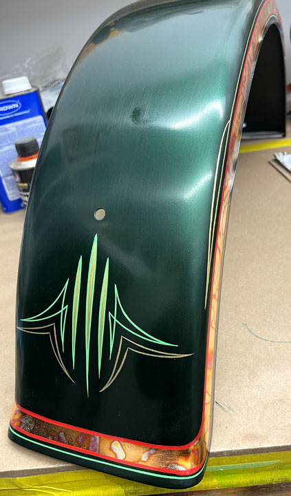 The fenders had Blue and Grey factory pinstiping on them, so we taped off the stripes, and added