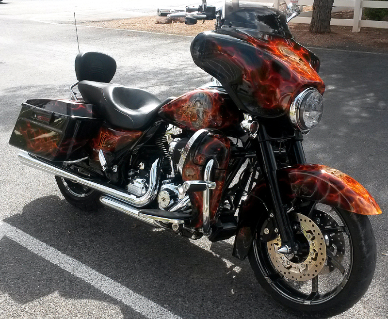 Here's a nice Road King with Traditional, "Hot Rod" flames, with Real Fire. Gansta' Skull