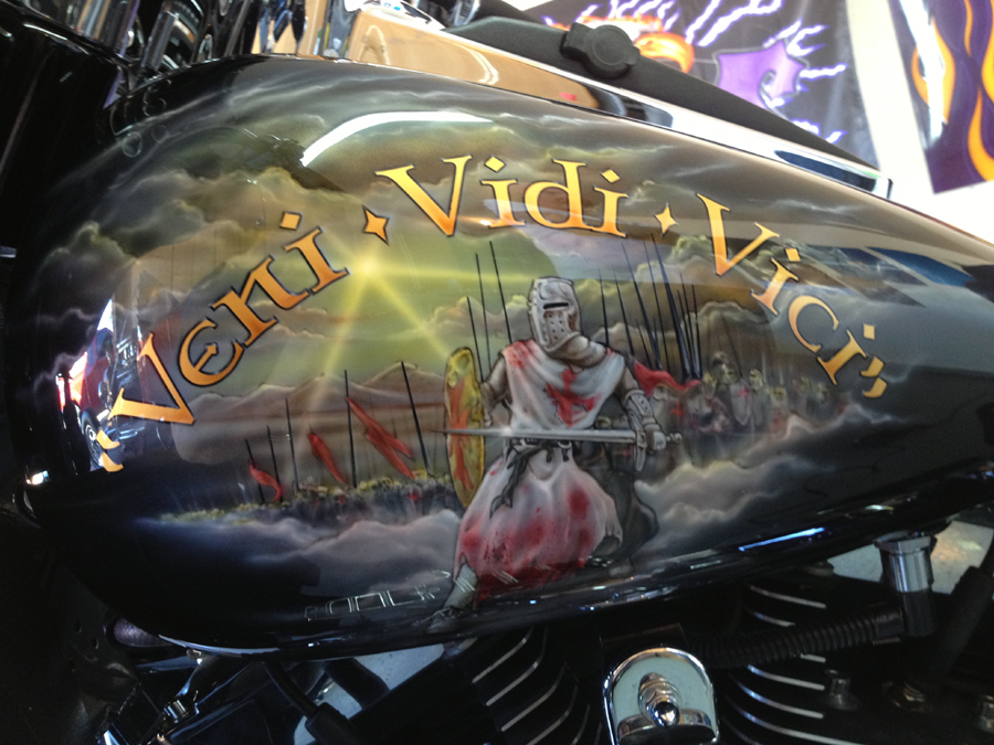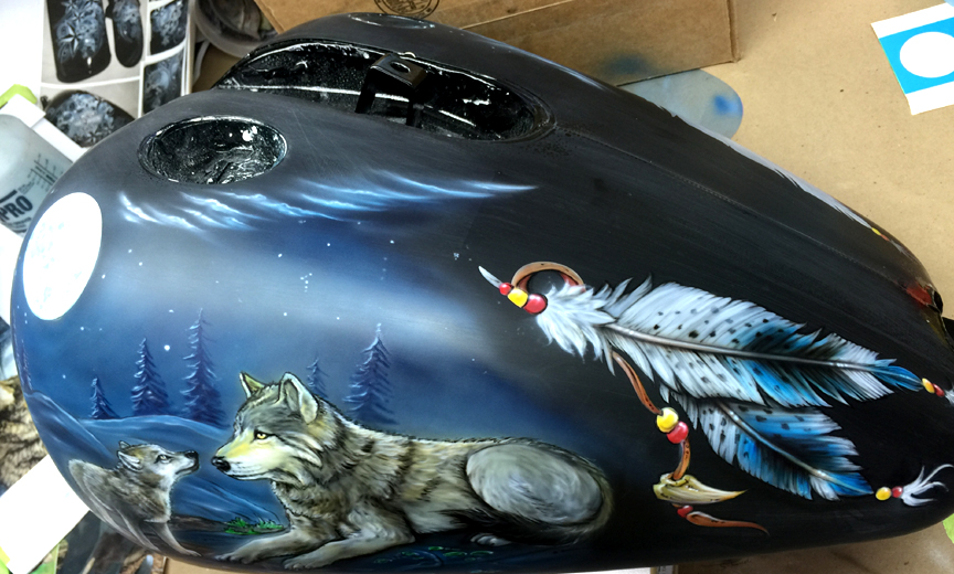 add airbrushing, clear, cut and buff for a totally new look!The Tank had an HD Sticker on it which we removed. Then we rebased it in Black, and added artwork.