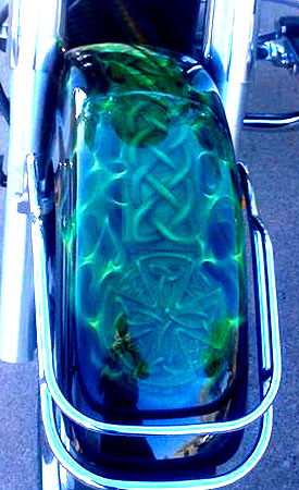 This bike was done through Vivid Dragon located here in Phoenix.Here's an example of GREEN Real Fire, TOXIC Flames. Complete with Skulls!